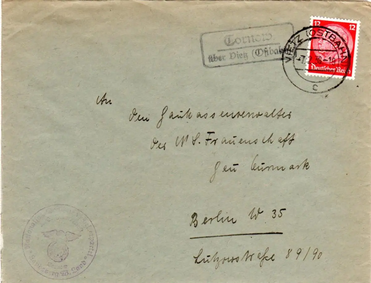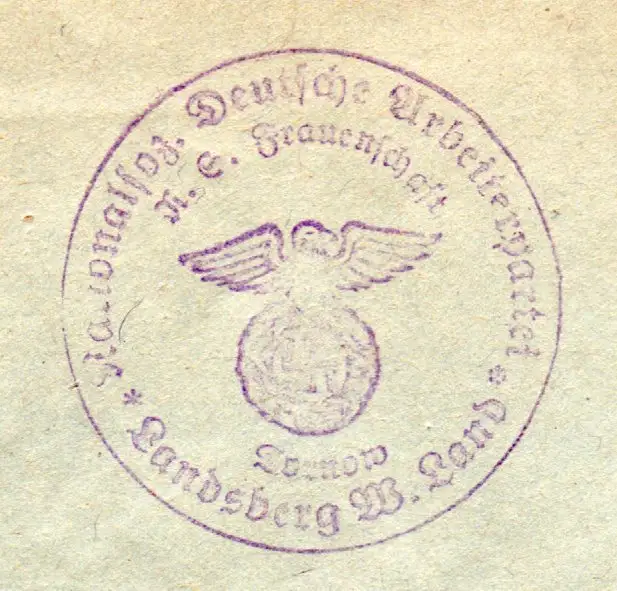 Landpoststellen II-Stempel. Rückseitig Briefstempel Nationalsoz. Deutsche Arbeiterpartei N.S. Frauenschaft Tornow Landsberg W. Land. Hoheitszeichen f. scan abgedeckt.
