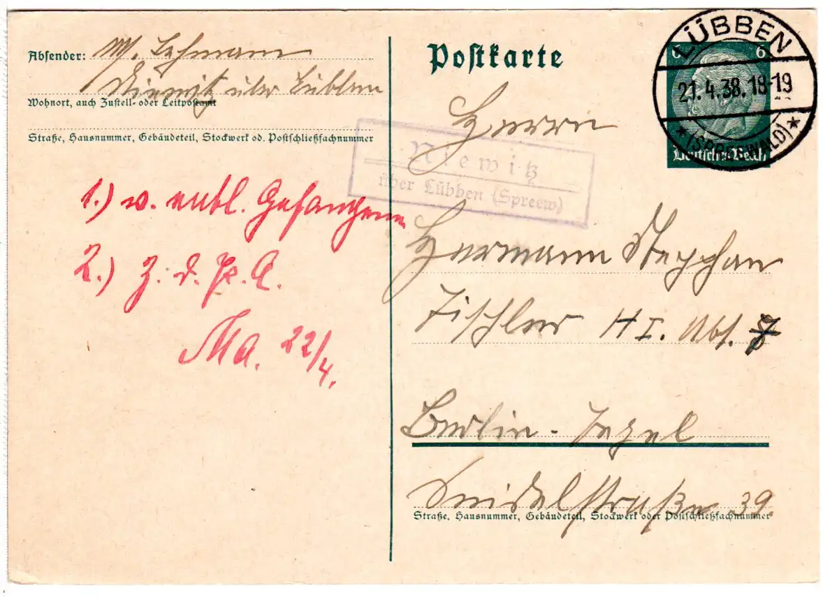 DR 1938, Landpost Stpl. NIEWITZ über Lübben auf Karte m. 6 Pf.