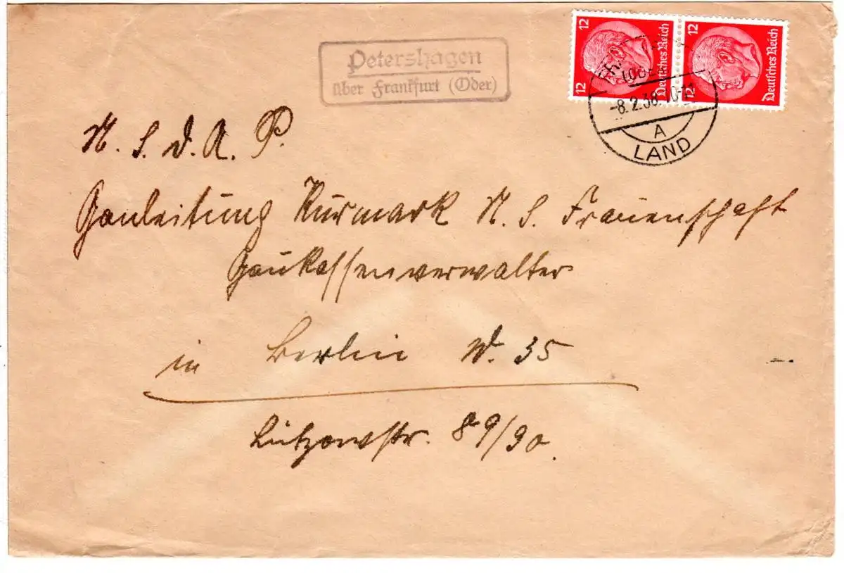 DR 1938, Landpost Stpl. PETERSHAGEN über Frankfurt (Oder) auf Brief m. 2x12 Pf.