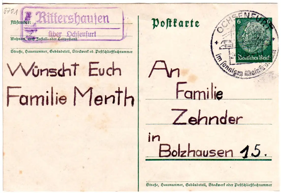 DR 1938, Landpost Stpl. RITTERSHAUSEN über Ochsenfurt auf 6 Pf. Ganzsache