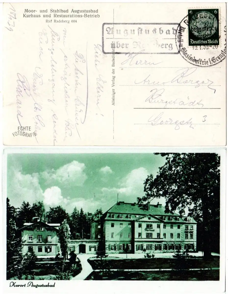 DR 1939, Landpost Stpl. AUGUSTUSBAD über Radeberg auf Gasthaus sw-AK m. 6 Pf.