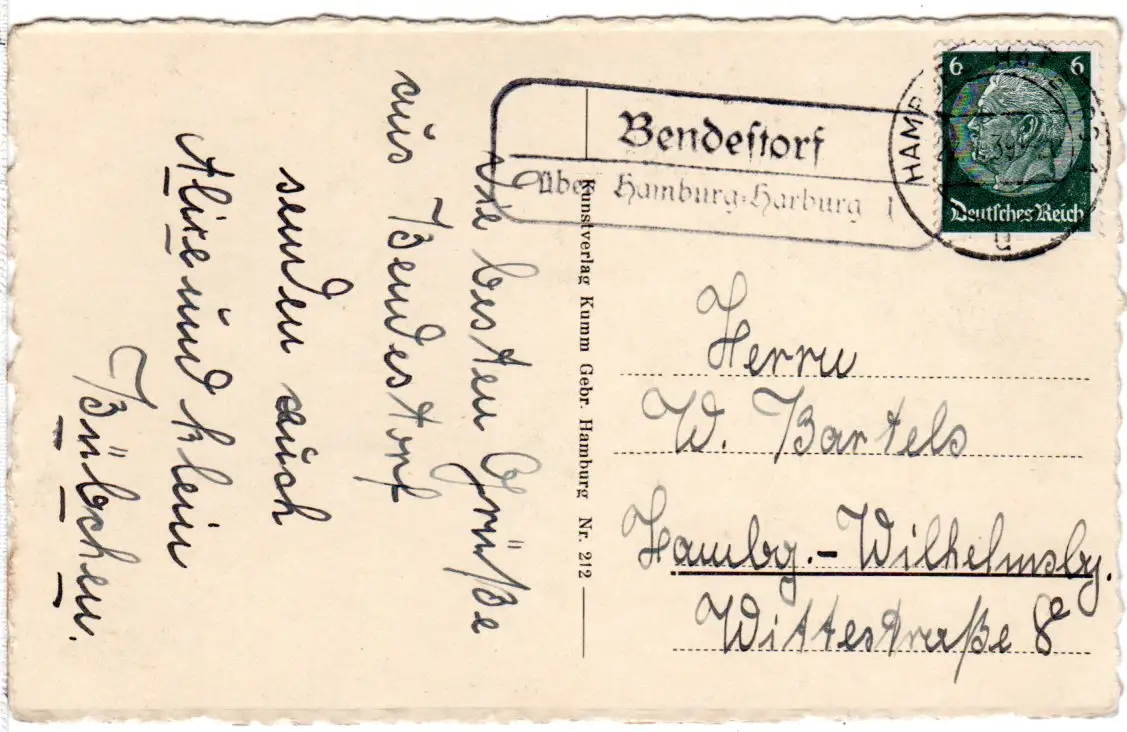 DR 1939, Landpost Stpl. BENDESTORF über Hamburg-Harburg auf AK m. 6 Pf.