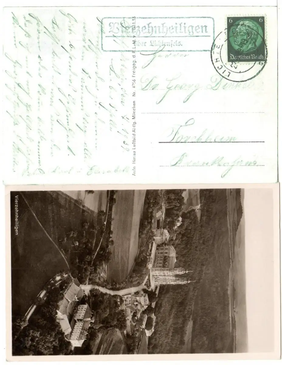 DR 1939, Landpoststpl. VIERZEHNHEILIGEN über Lichtenfels auf sw-AK m. 6 Pf.