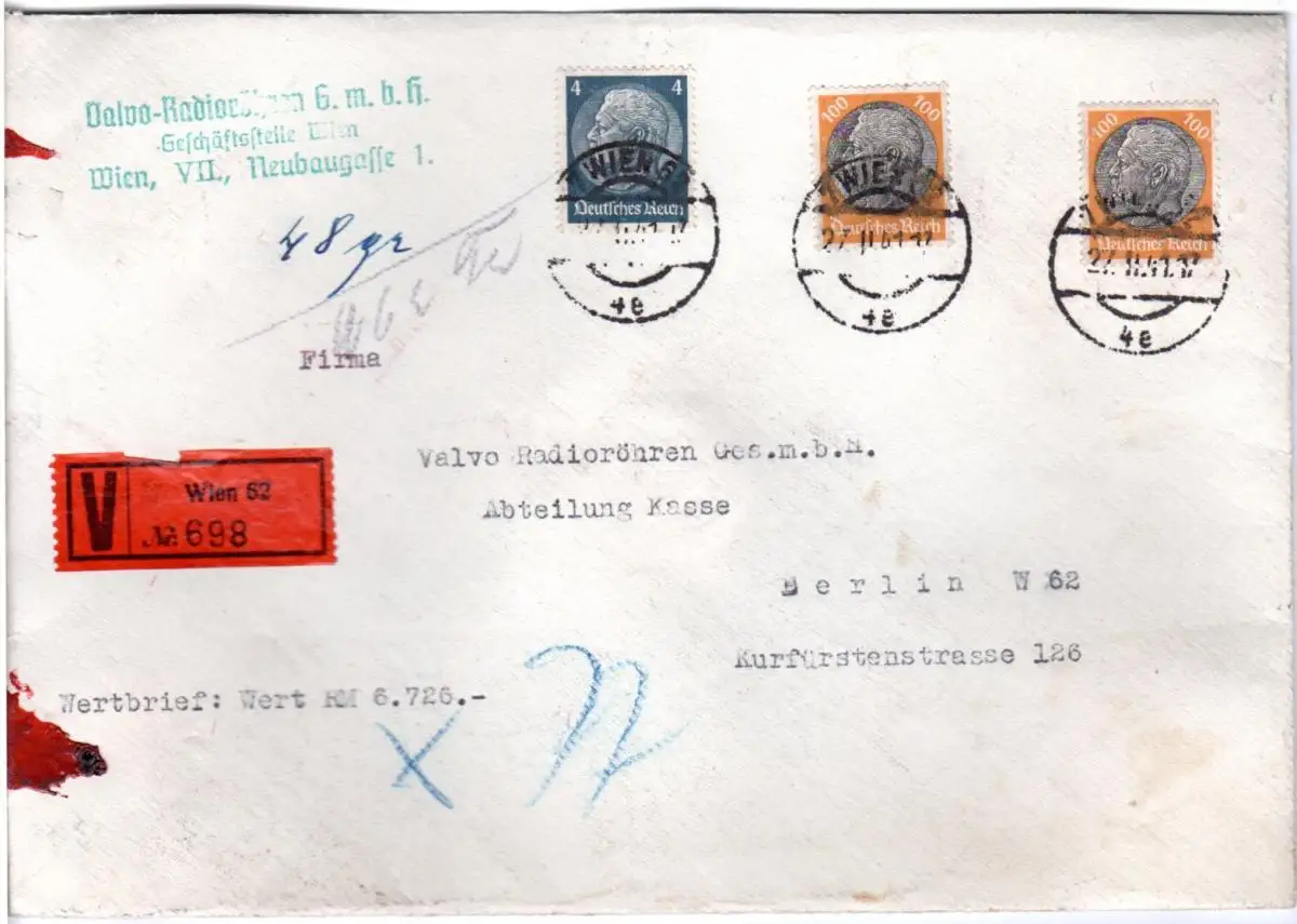 DR 1941, 4+2x100 Pf. auf portorichtigem Ostmark Wertbrief v. Wien n. Berlin