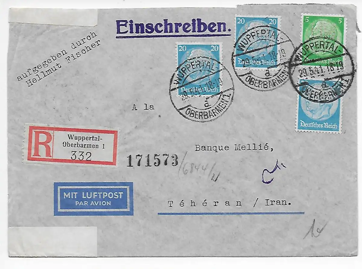 DR 1941: Einschreiben Wuppertal-Oberbarmen nach Teheran, OKW Zensur