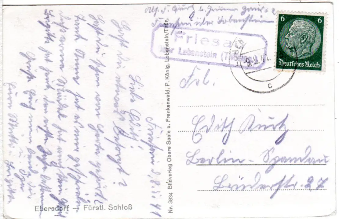 DR 1941, FRIESAU über Lobenstein, Landpost Stpl. auf Karte m. 6 Pf.