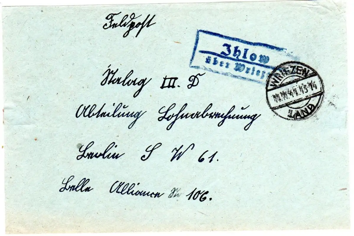 DR 1941, Landpoststpl. JHLOW über Wriezen auf Feldpost Briefteil