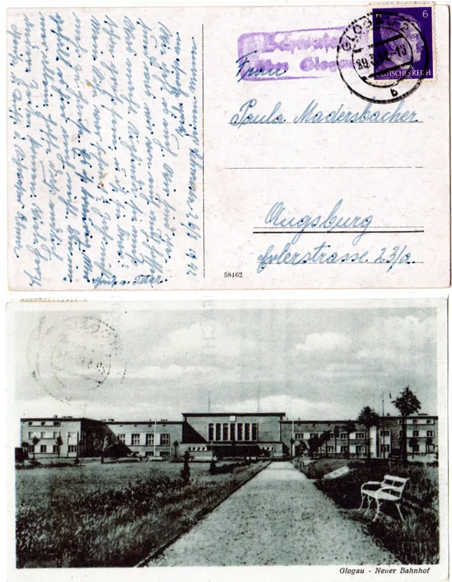 DR 1942, Landpost Stpl. SCHWUSEN über Glogau auf sw-AK Neuer Bahnhof m. 6 Pf.