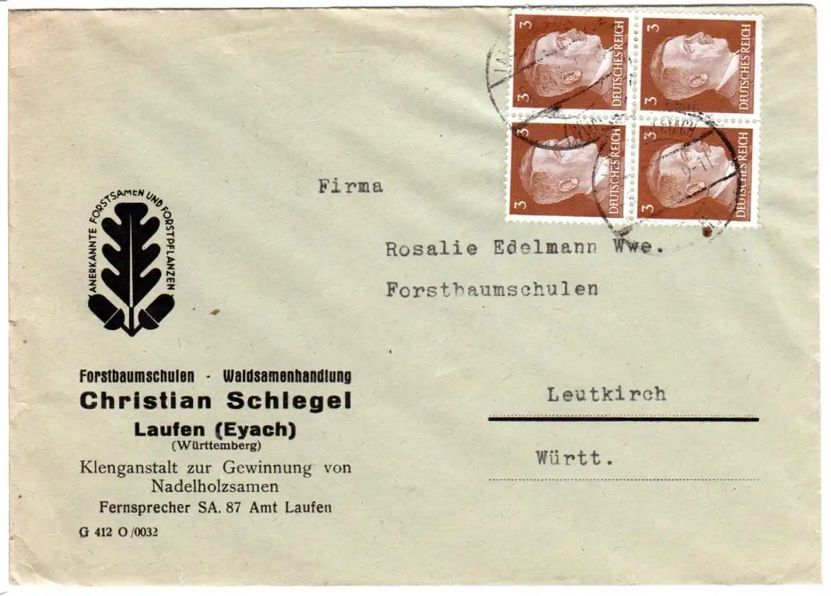 DR 1943, 4er-Block 3 Pf. auf Firmen Brief v. Laufen (Eyach) n. Leutkirch