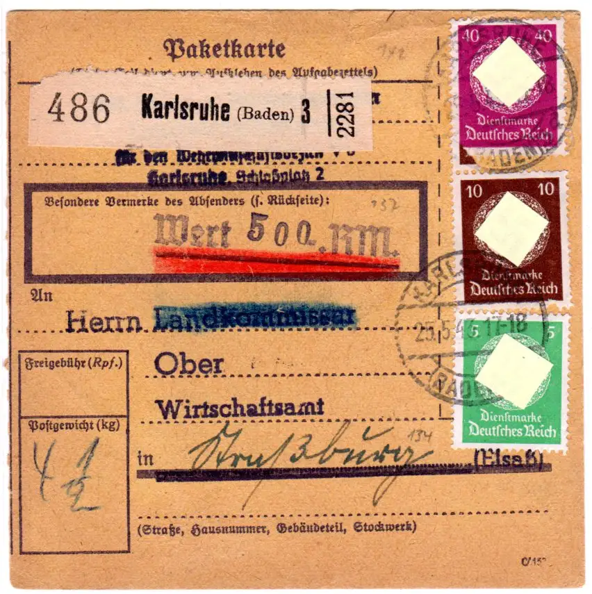 DR 1943, 5+10+40 Pf. Dienst auf Wert Paketkarte v. Karlsruhe n. Straßburg