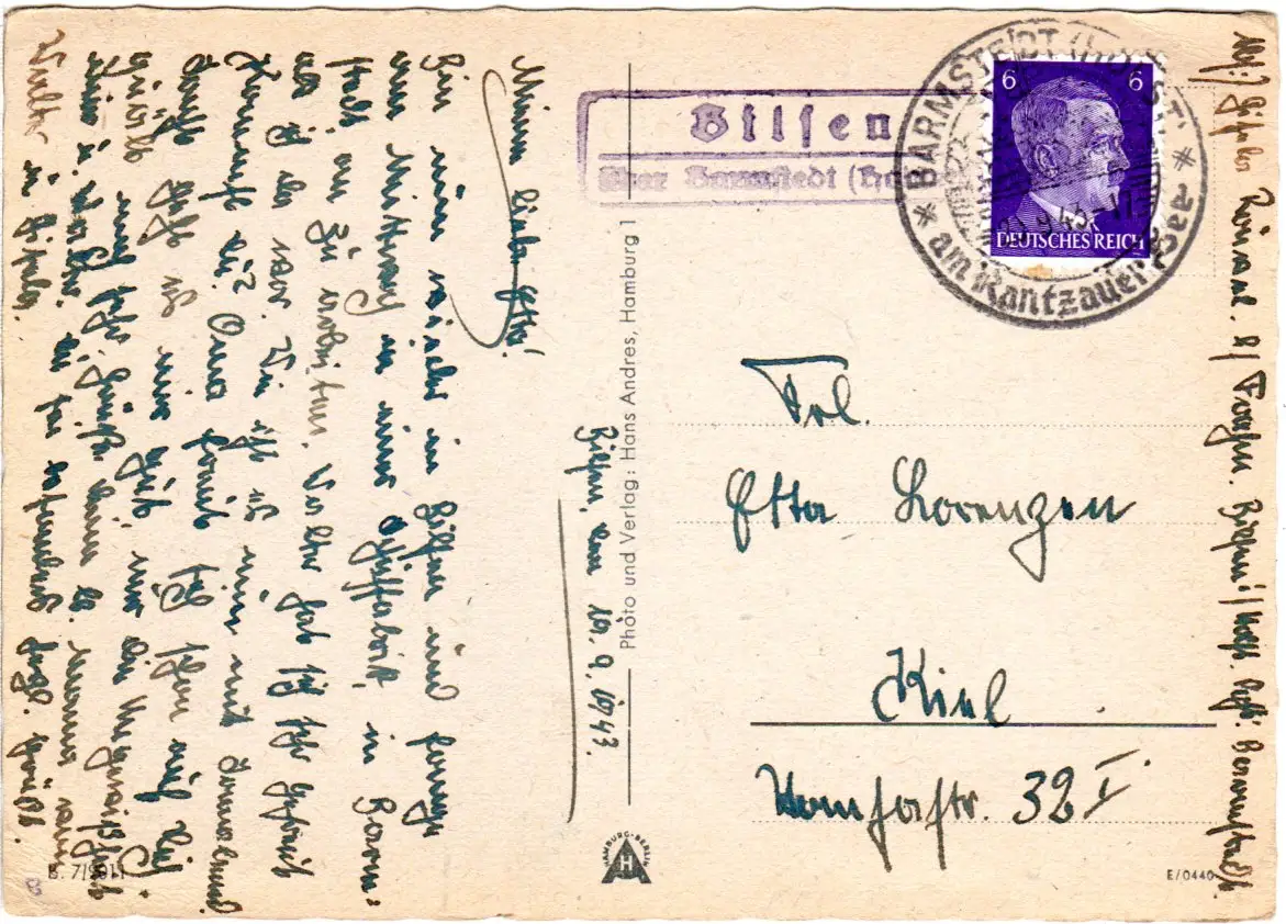 DR 1943, Landpost Stpl. BILSEN über Barmstedt auf sw-AK m. 6 Pf.