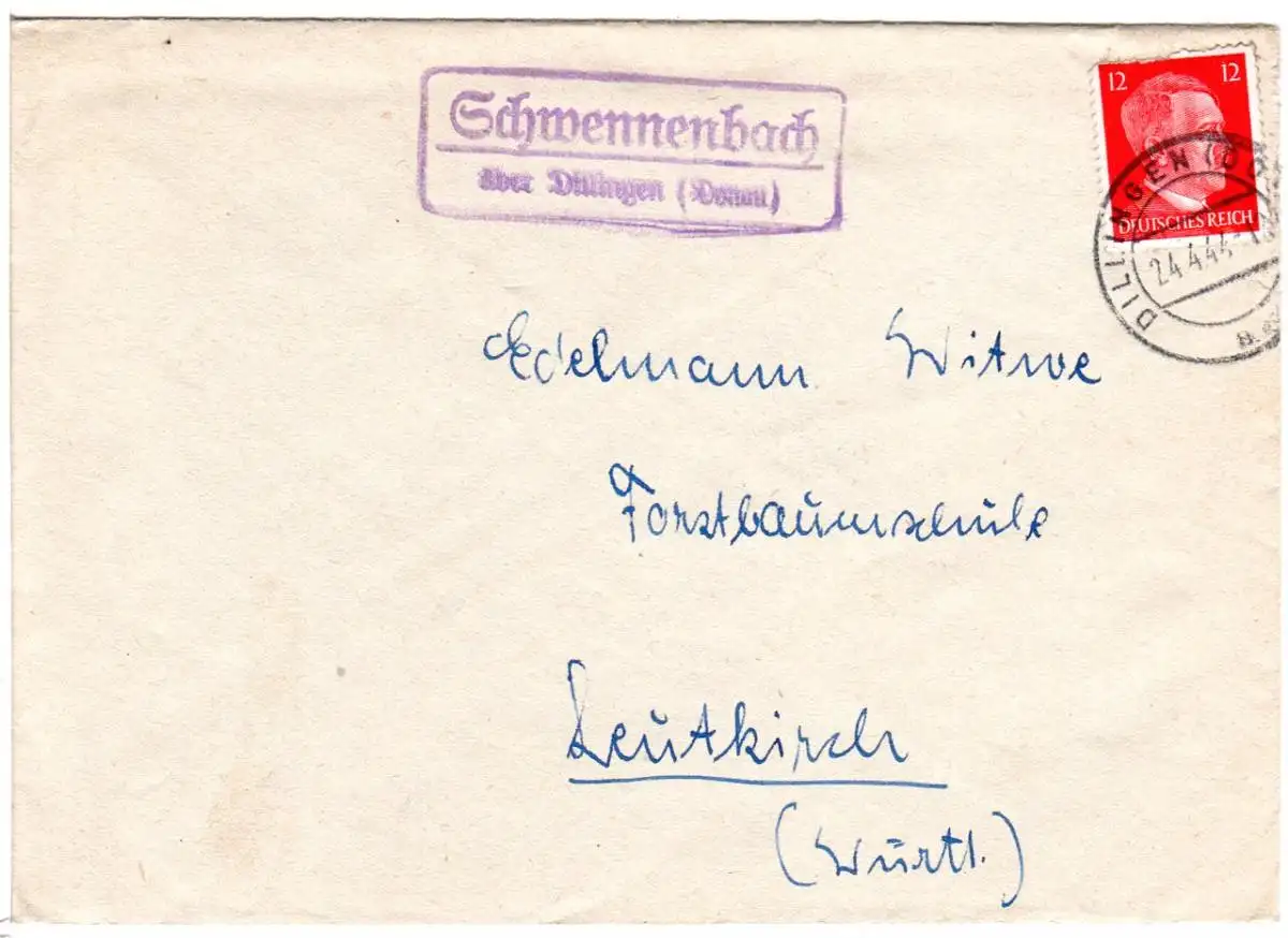 DR 1944, Landpost Stpl. SCHWENNENBACH über Dillingen (Donau) auf Brief m. 12 Pf.