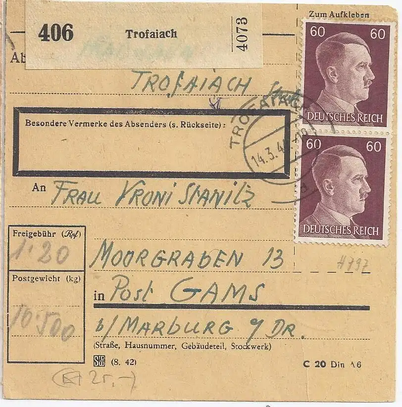 DR 1944, MeF Paar 60 Pf. auf Ostmark Paketkarte v. Trofaiach. #1322