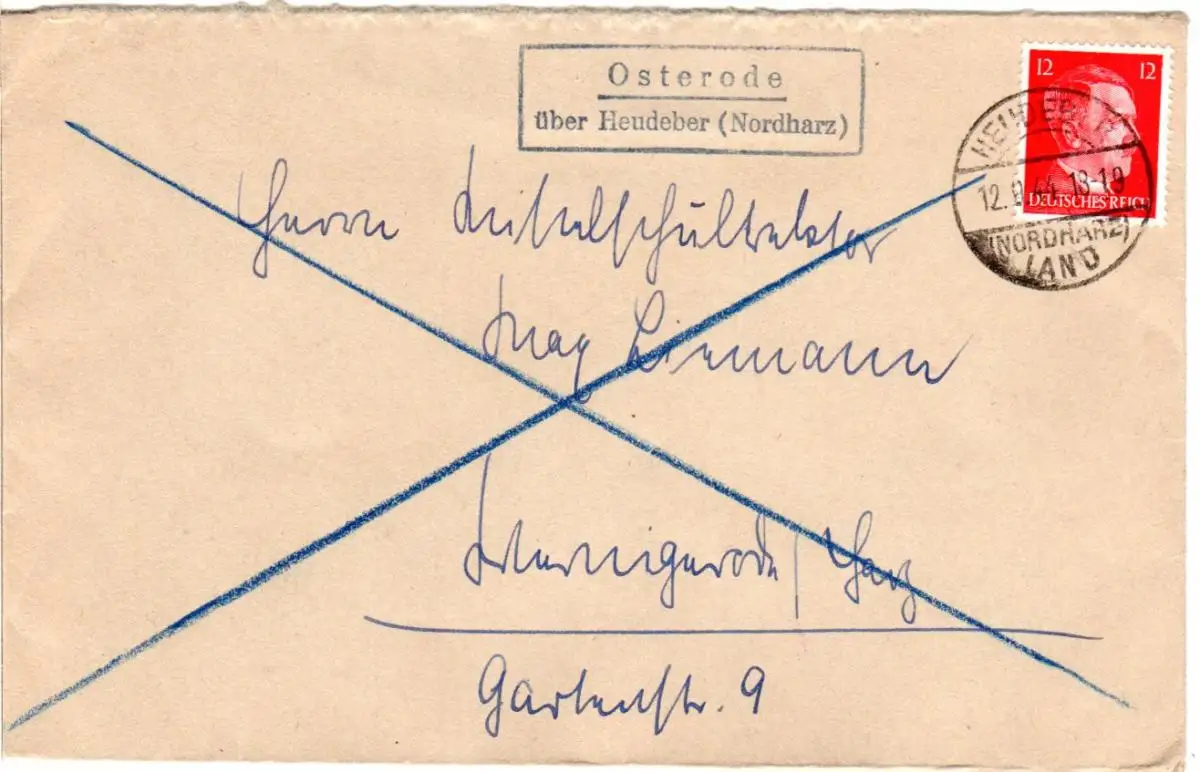 DR 1944, OSTERODE über Heudeber (Nordharz), Landpost Stpl. auf Brief m. 12 Pf.