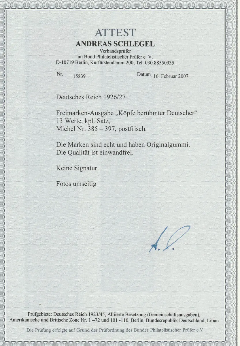Die Erhaltung ist einwandfrei, s. Abbildung und Attest Schlegel BPP. Ohne Signaturen. Michelwert 1.200,00 €.
