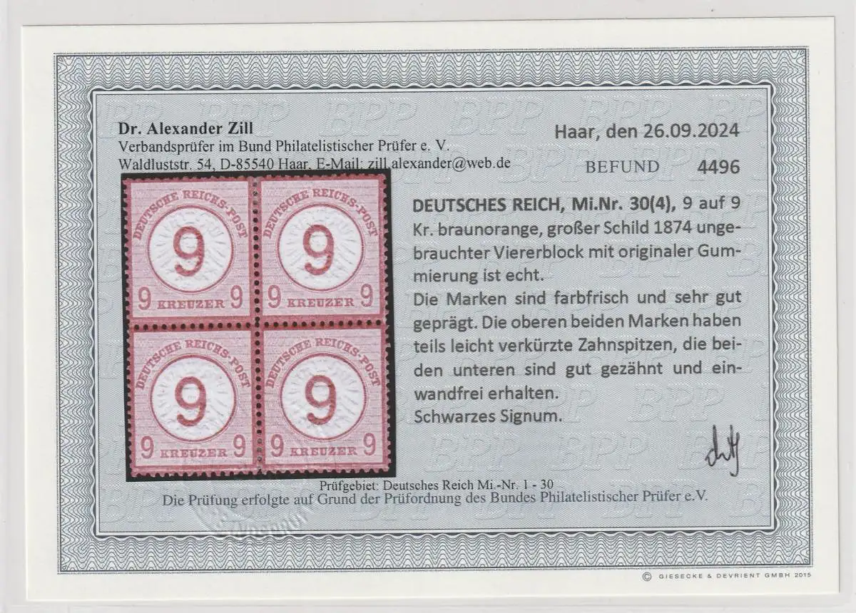 DR: Brustschild Nr. 30 im ungebr. Viererblock, Befund Zill BPP