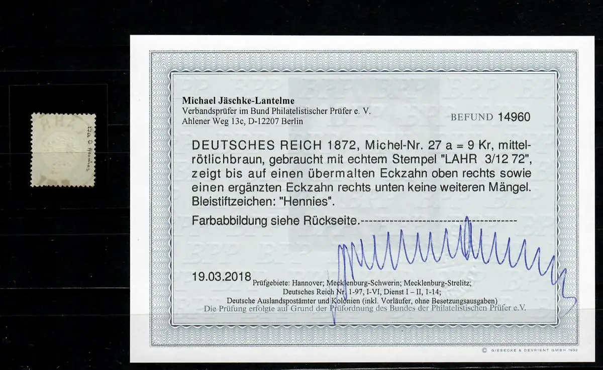 DR Dienst: MiNr. 27a, gestempelt Lahr, BPP Befund