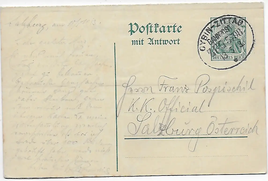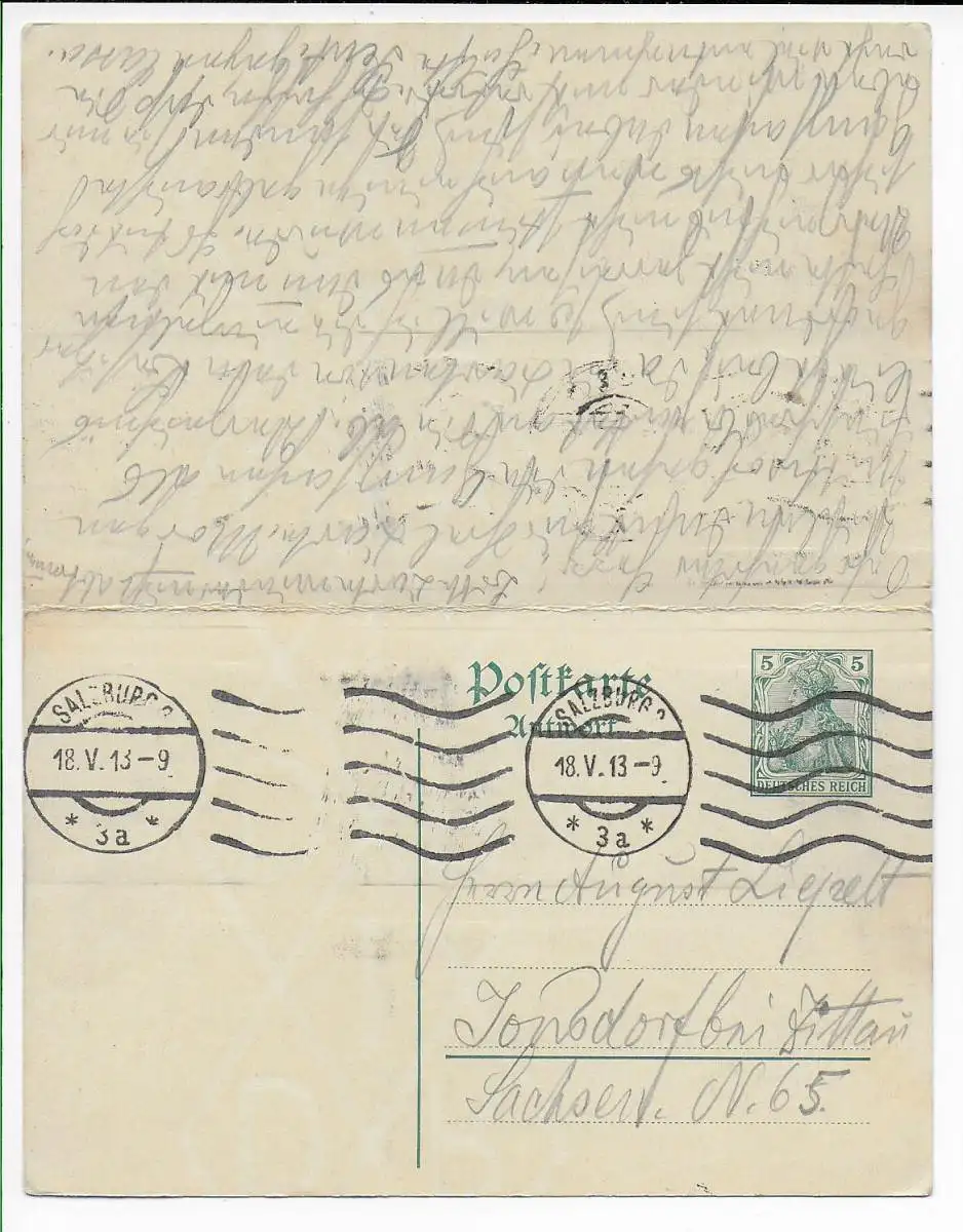 DR: Doppelkarte Bahnpost Oybin-Zittau, 1913, Salzburg