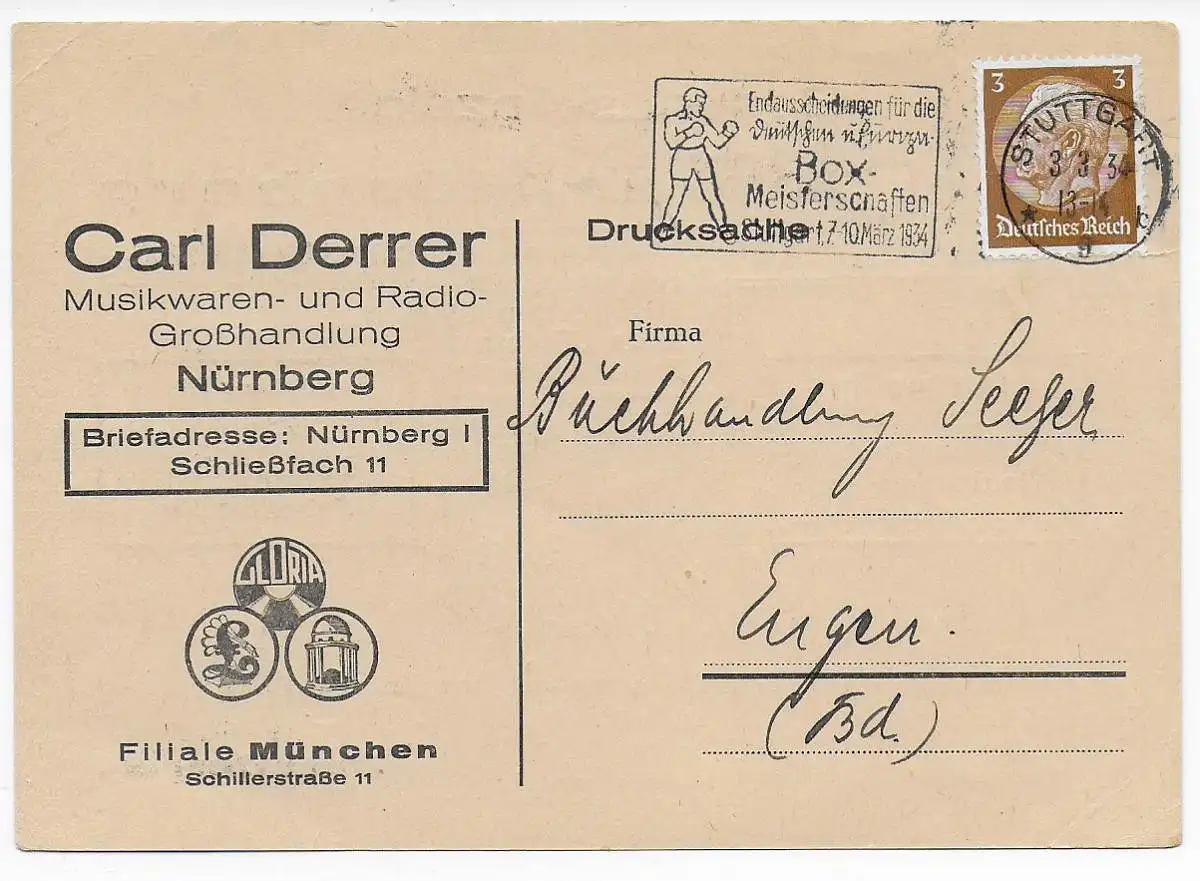 DR: Drucksache Karte Stuttgart, Werbung Musik, Box-Meisterschaften, 1934