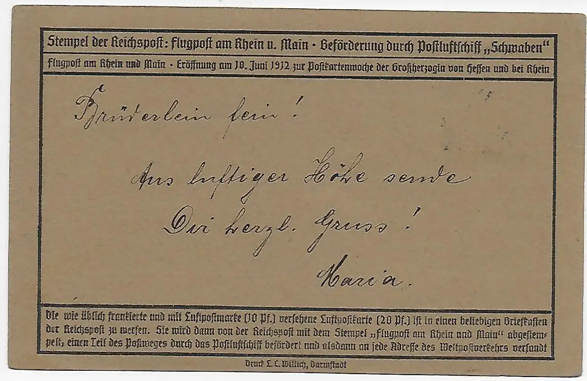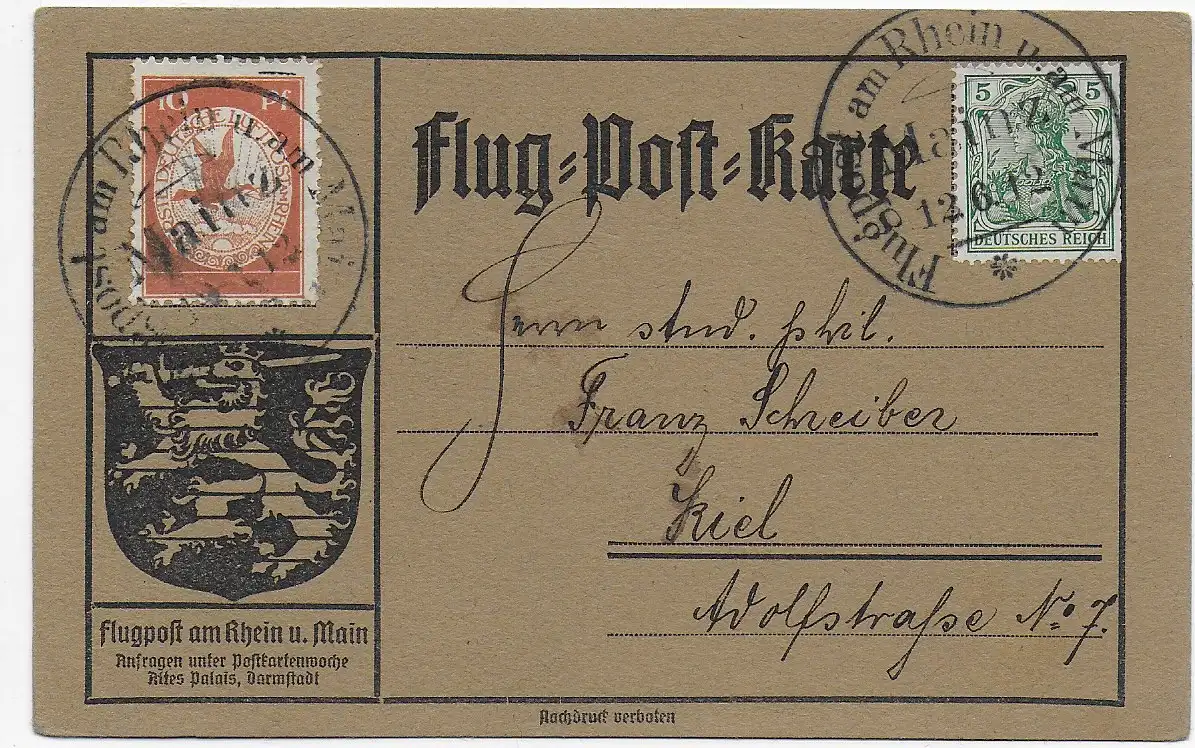 DR: Flug-Post-Karte: Flugpost am Rhein und am Main nach Kiel, 1912