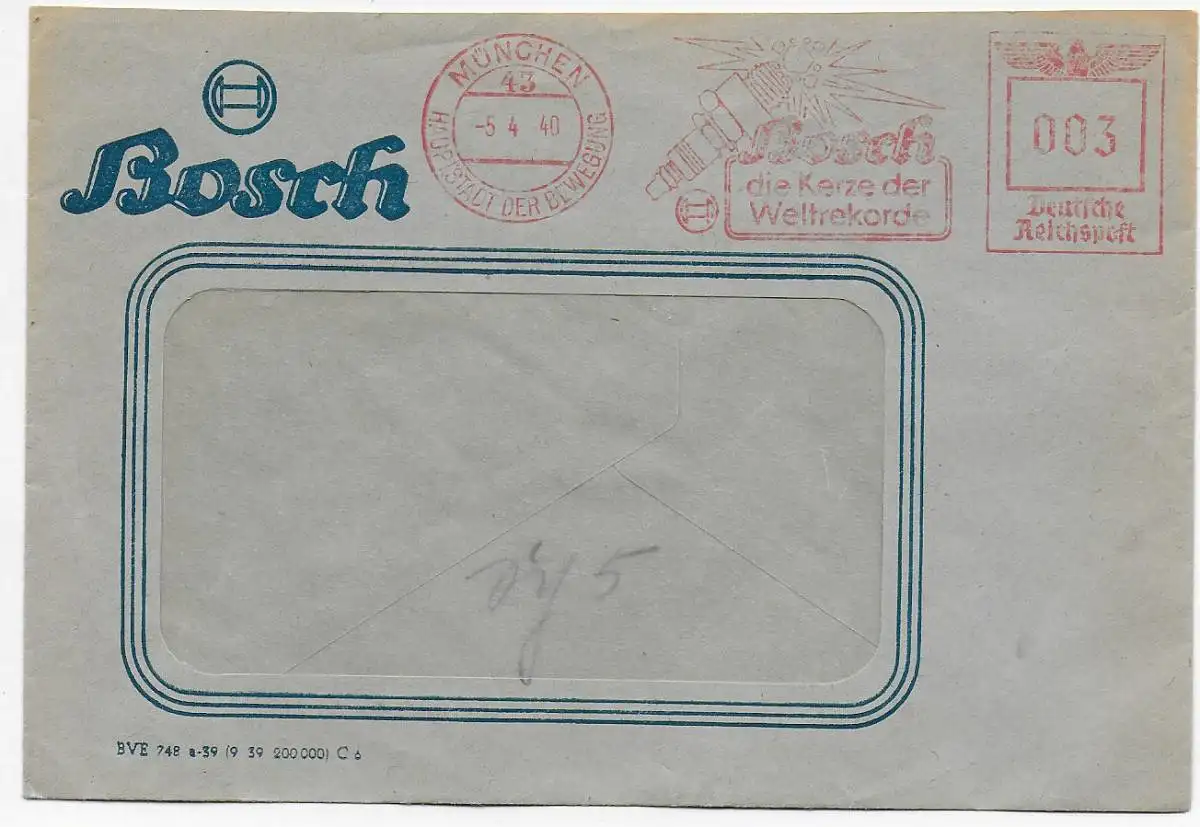 DR: Freistempel 1940 München Bosch-Zündkerze der Weltrekorde, Drucksache