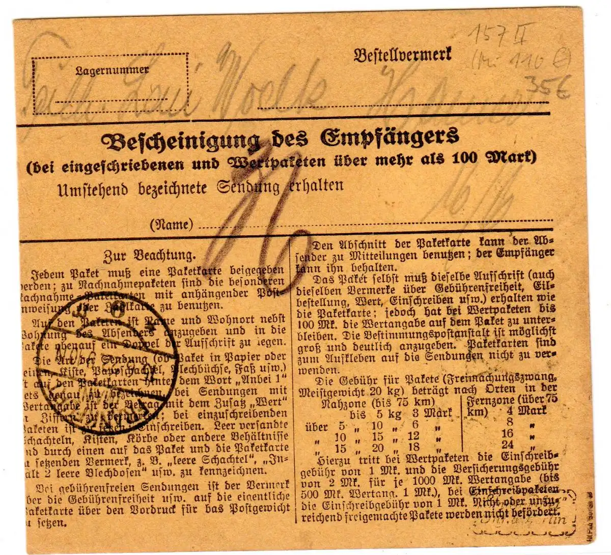 DR/Infla: Paketkarte mit 4x 157II - reine MeF, gepr.