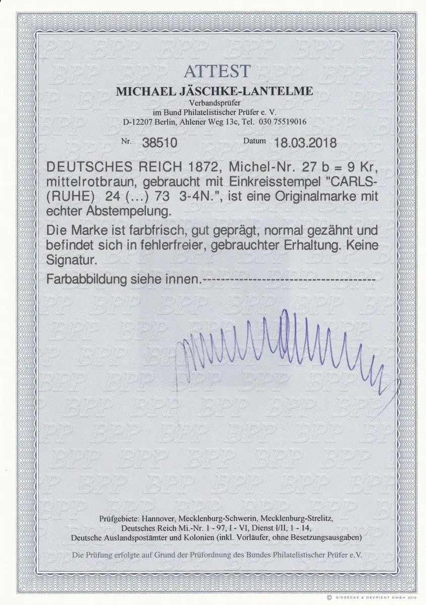 DR: MiNr. 27b, gestempelt Carlsruhe, BPP Attest