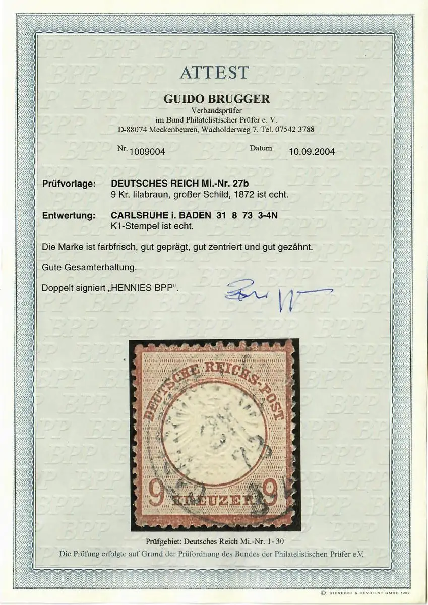 DR: MiNr. 27b, gestempelt Karlsruhe, farbfrisch, BPP Attest