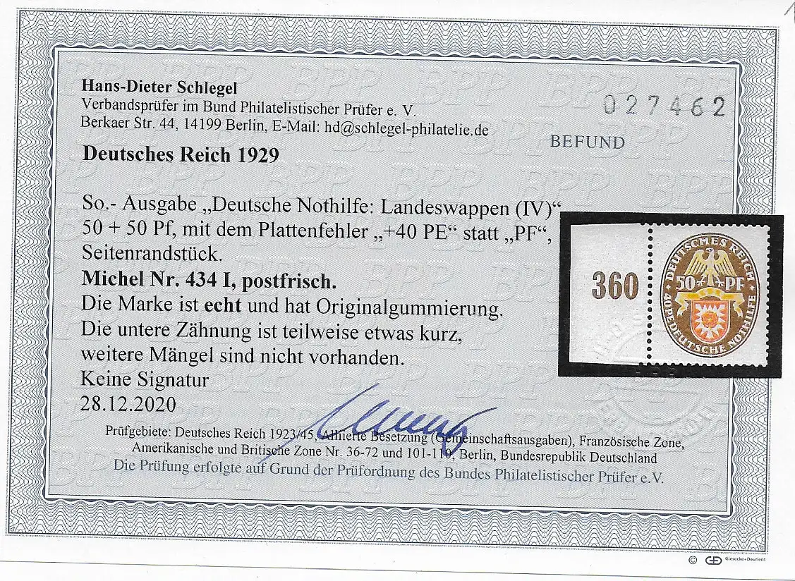 DR: MiNr. 434 I, postfrisch, BPP Befund