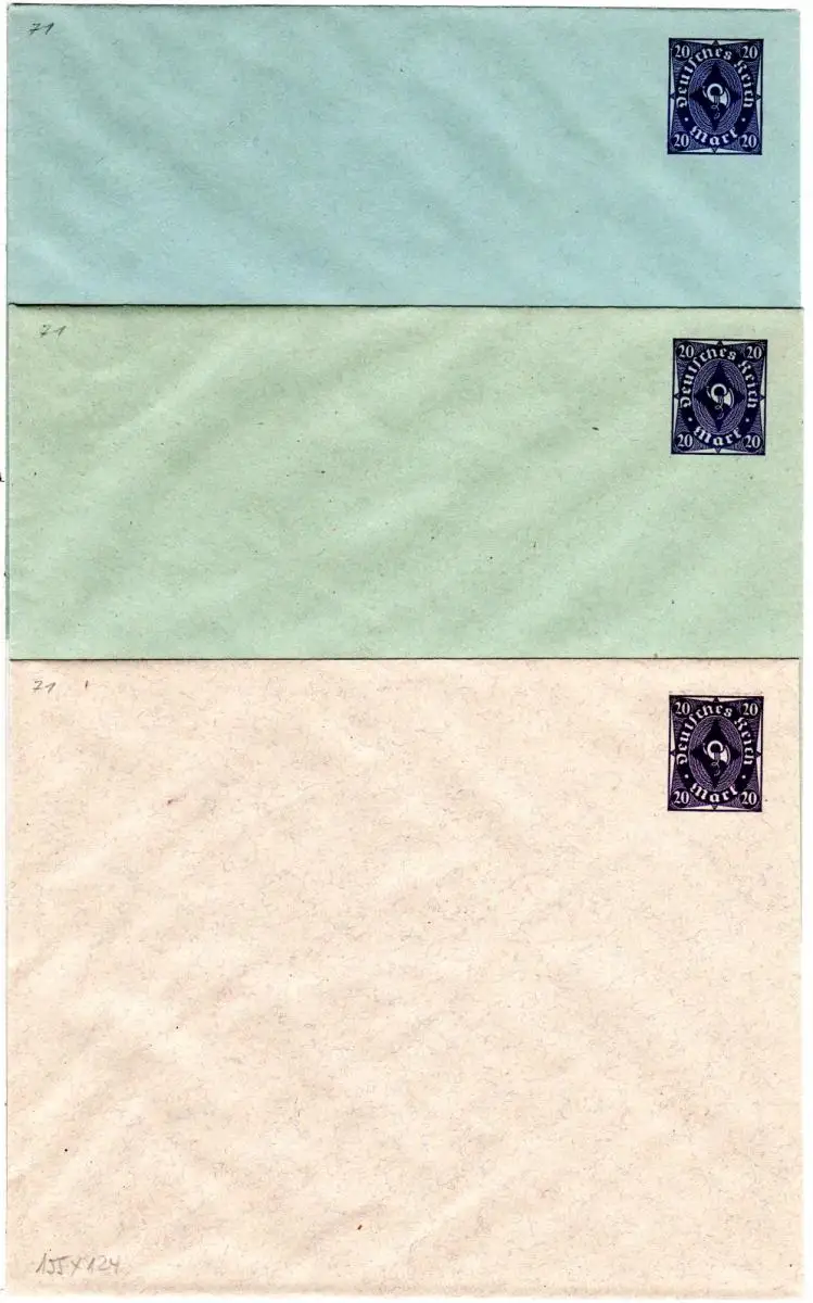 DR, drei ungebr. 20 Mk. Ganzsachenumschläge m. unterschiedlichen Papierfarben
