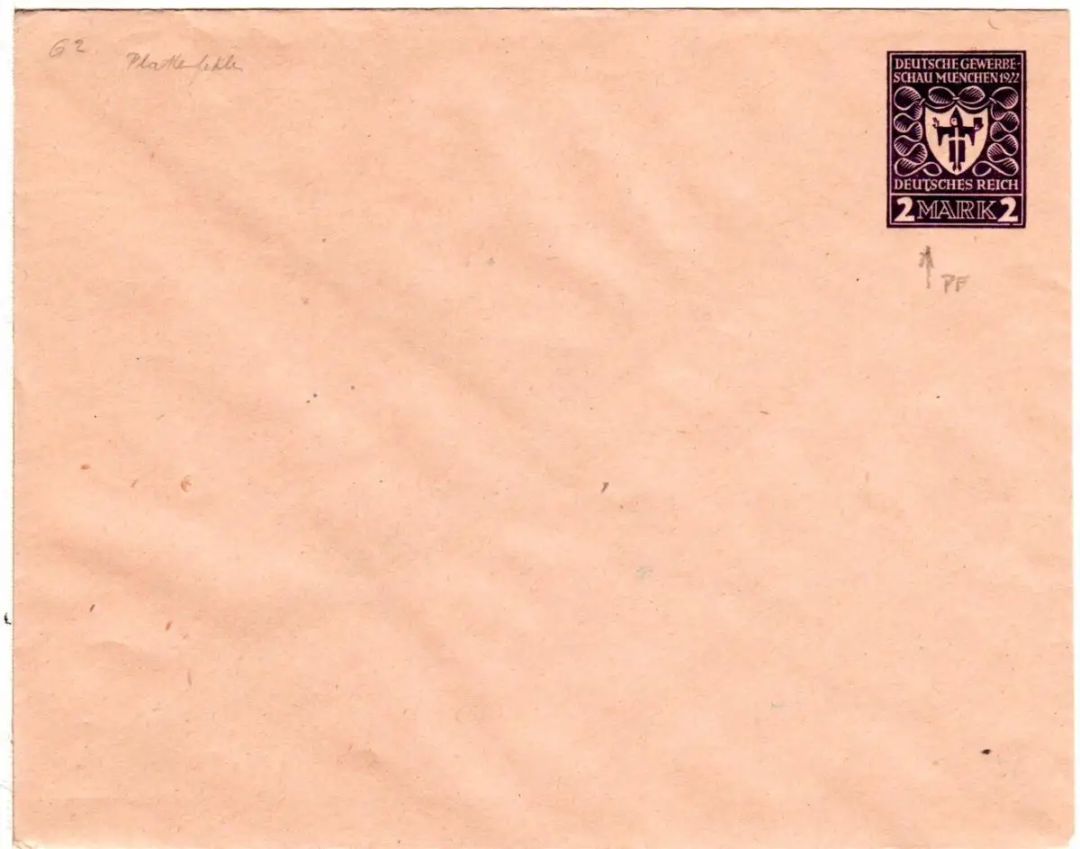 Ungebrauchter Infla Privatganzsachenumschlag Dt. Gewerbeschau München 1922, rosa Papier. Wertstempel m. Plattenfehler "weisser Punkt unter TS v. DEUTSCHES REICH".