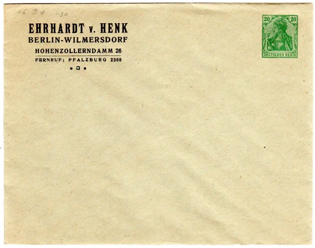 DR, ungebr. 20 Pf. Germania Privatganzsache Brief E. v. Henk, Berlin-Wilmersdorf