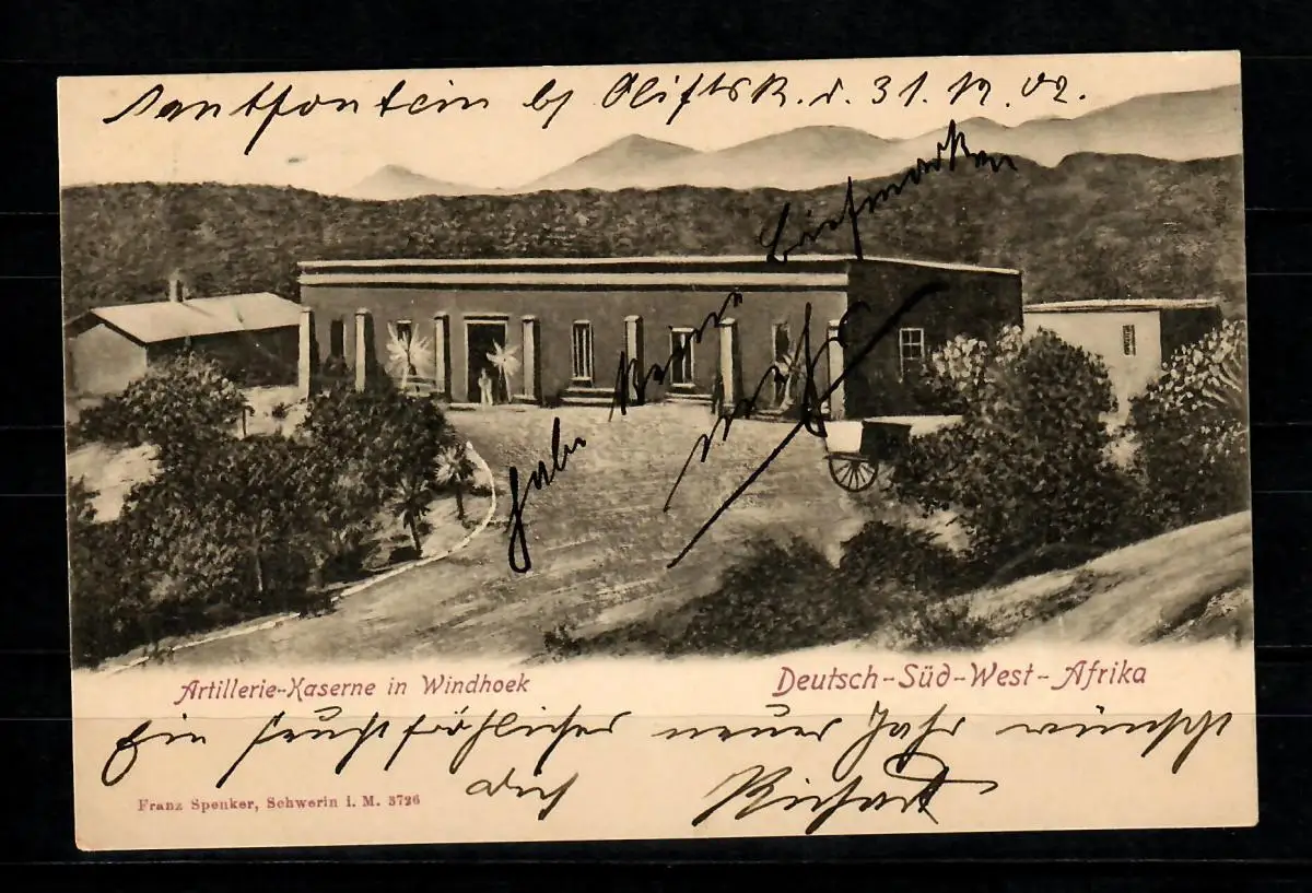 29.12.02: Ansichtskarte der Artillerie-Kaserne in Windhoek, geschrieben in Bechuanaland an der Wasserstelle Sandfonein bei Olifantsk(loof) vom Lagerverwaltung der deutschen Abteilung der Deutsch-Englischen Grenzvermessungsexpedition, dem Gefreiten Richard Weber nach Windhoek mit der Information: Habe keine Briefmarken mehr.