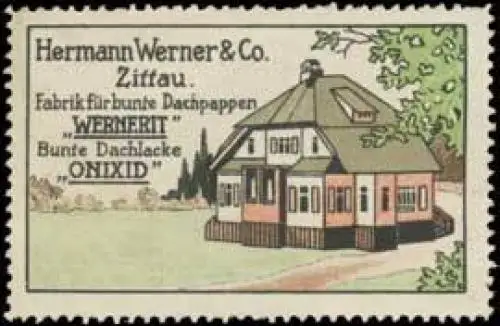 Fabrik für bunte Dachpappen Wernerit, bunte Dachlacke Onixid, Größe/Zustand: 3x6 , guter Zustand, Original alte Reklamemarke die seinerzeit für die Werbung benutzt wurde