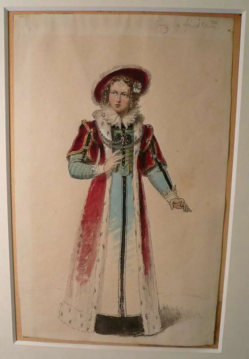 Daffinger, Moritz Michael (1790 Wien 1849),, Kostümentwurf "Herzogin zu Friedland" zu Schillers Wallenstein. Aquarell mit Gold- und Deckweisshöhung über Tuschfeder