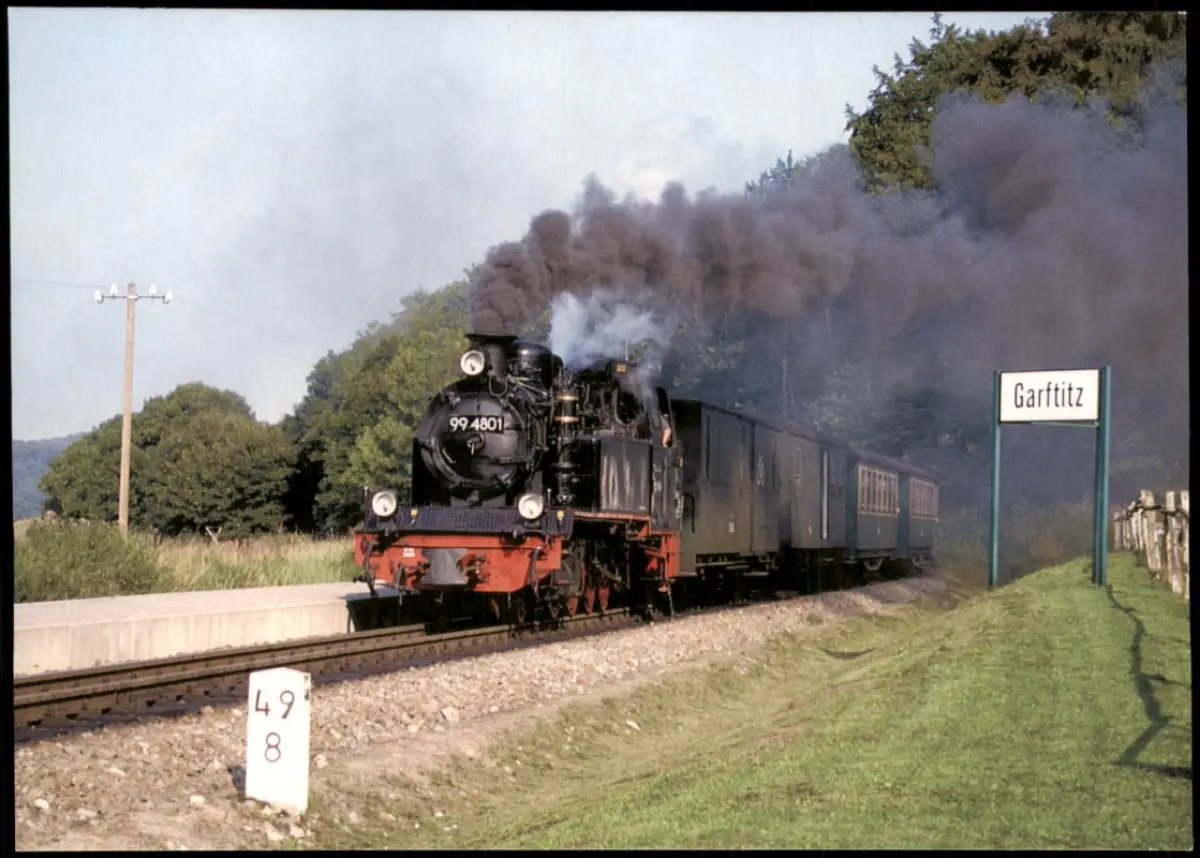 Name: Dampflok 99 4801 der Rügenschen Kleinbahn mit Reisezug am Haltepunkt Garftitz