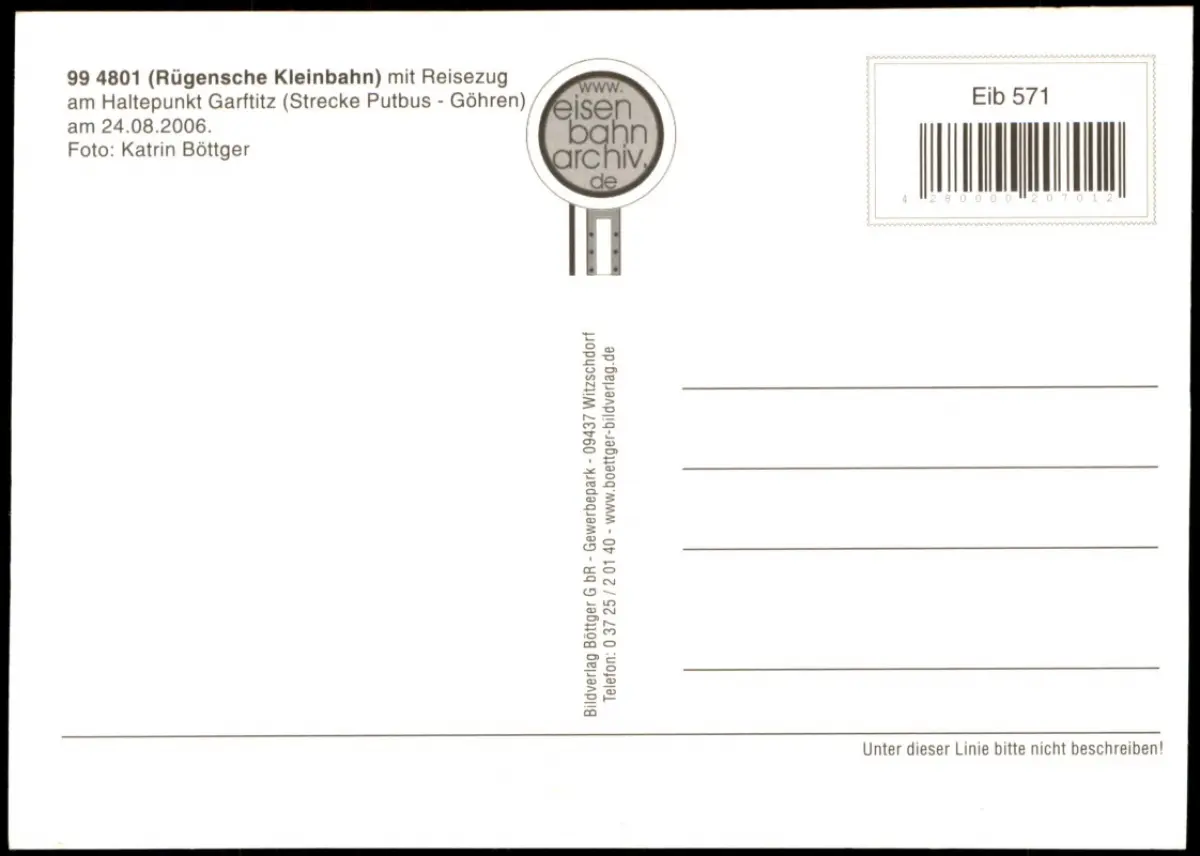 Infos: Die Dampflok 99 4801 der Rügenschen Kleinbahn ist mit einem Reisezug am Haltepunkt Garftitz auf der Strecke Putbus - Göhren zu sehen. Das Foto wurde am 24.08.2006 von Katrin Böttger aufgenommen. Die Postkarte wurde vom Bildverlag Böttger GbR mit Sitz in 09437 Witzschdorf herausgegeben und trägt die Seriennummer Eib 571. Weitere Informationen sind über www.bahnarchiv.de und www.boettger-bildverlag.de verfügbar.