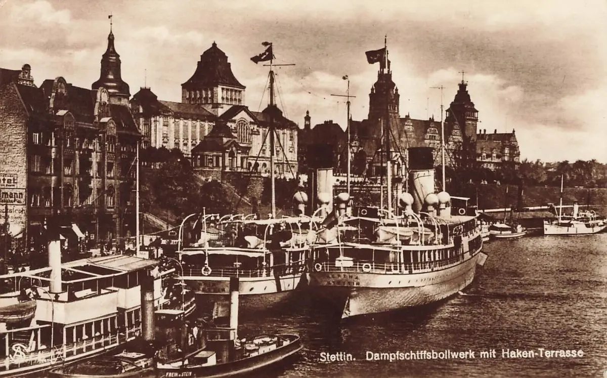 Dampfschiffsbollwerk mit Haken-Terrasse Stettin Pommern Postkarte AK 1931