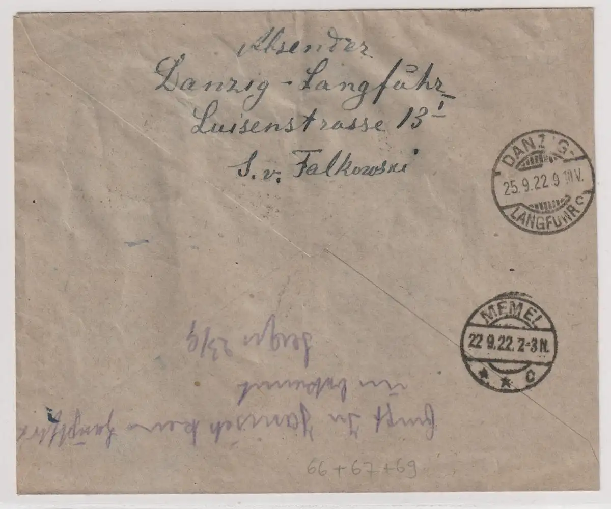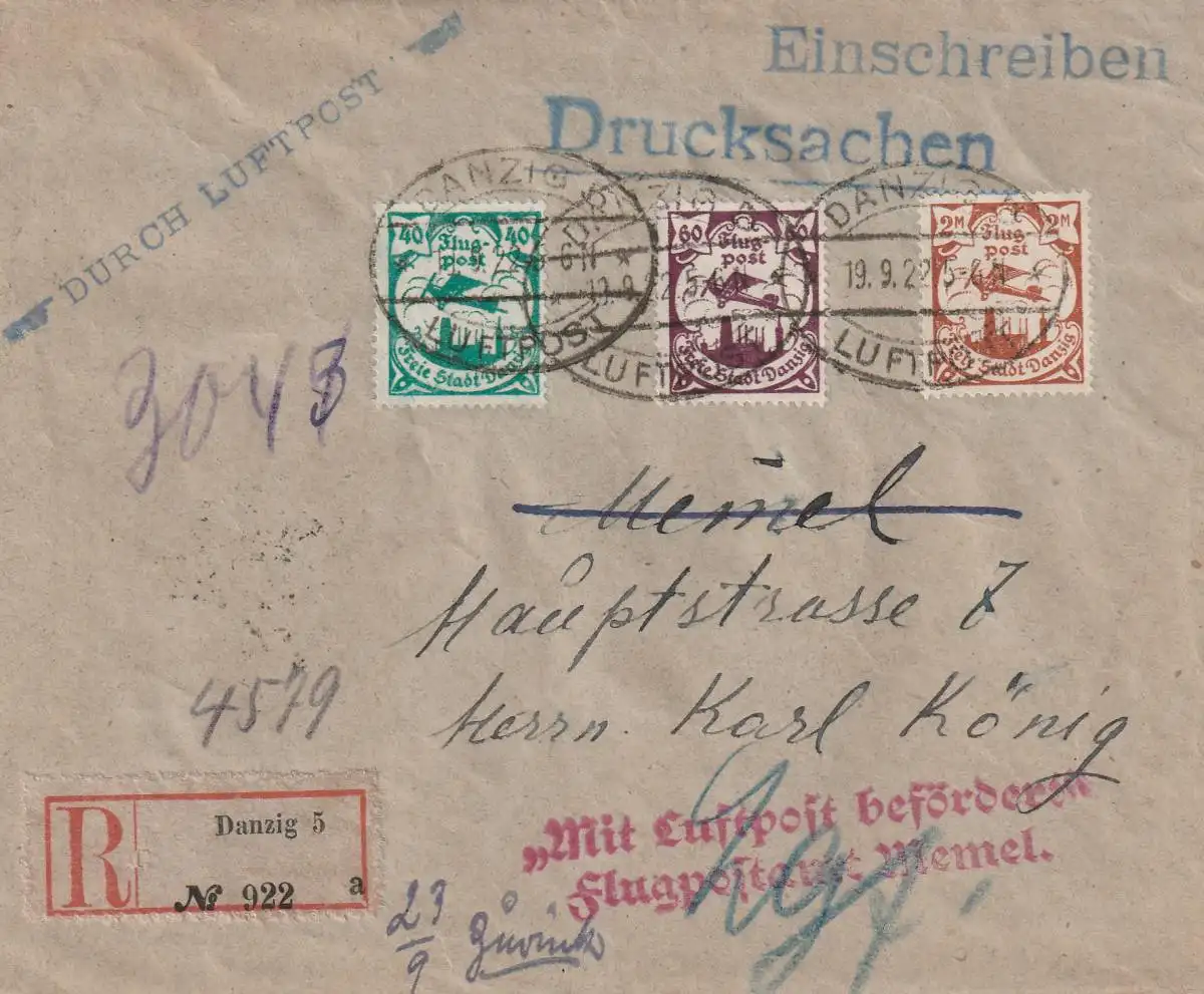 Sehr gute Erhaltung, zurückbefördert nach Danzig. Ank.-stempel Memel und Danzig. Roter Beförderungsstempel vom Luftpostamt Memel.