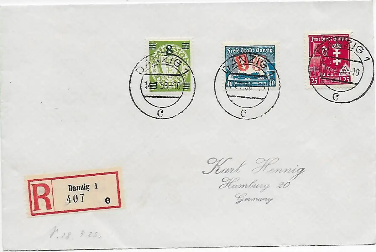 Danzig: Einschreiben 1938 an Hennig, Hamburg