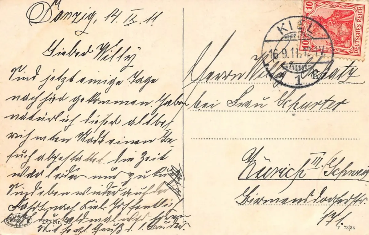 Rückseite: gelaufen 1911 von Kiel