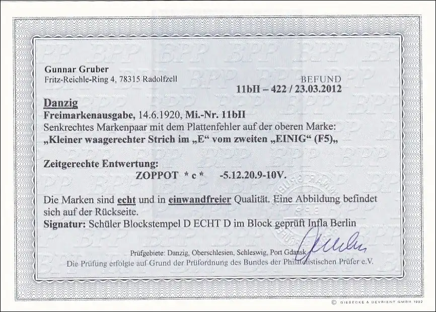 Danzig MiNr. 11 b II, gestempelt im Paar mit BPP Befund