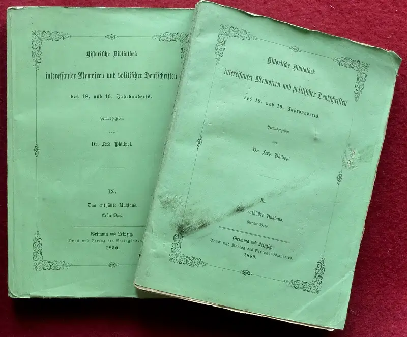 Grimma u. Leipzig, Verlags-Comptoir, 1850, XXII, 352 S.; 2 Bll., 344 S. (= Historische Bibliothek interessanter Memoiren und politischer Denkschriften des 18. und 19. Jahrhunderts, Bde. 9+10). Gr.-8vo. Bedruckte Brosch. d. Zt.