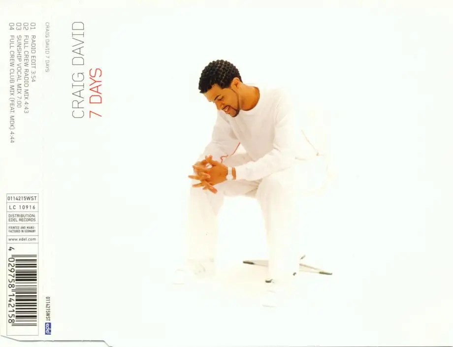 CD Single Craig David - 7 Days, Zustand CD M- Hülle M-; Made in Germany 2000 Wildstar 0114215 WST, Tracks Radio Edit 3:54, Full Crew Radio Mix 4:43, Sunship Vocal Mix 7:00, Full Crew Club Mix 4:44