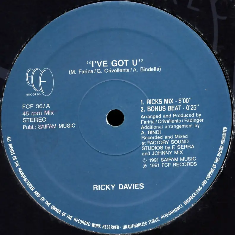 12" Maxi Ricky Davies - I've Got U, Einheitscover der Plattenfirma; Farina / Crivellente / Fadinger, Zustand Platte M- Hülle VG+; Made in Italy 1991 FCF Records FCF 36, Tracks Ricks Mix 5:00, Bonus Beat 0:25, Radio Edit 2:50, Instr. 2:30, Last Vers. 1:05