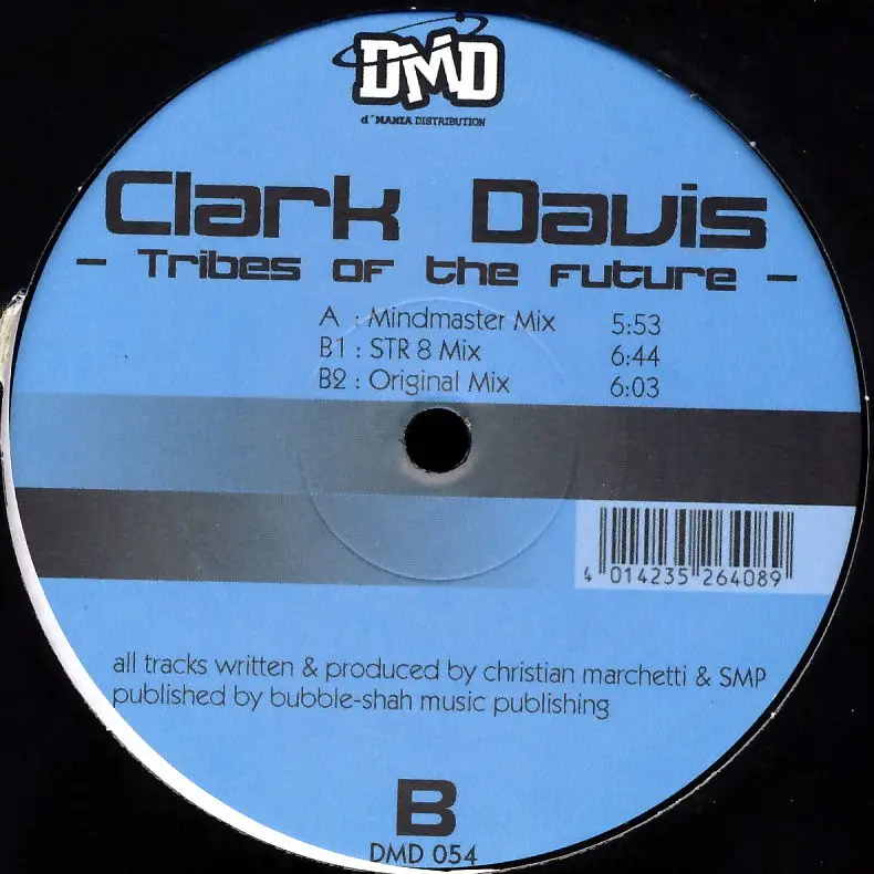 12" Maxi Clark Davis - Tribes Of The Future, neutrales Cover mit Info-Aufkleber, Zustand Platte VG+ Hülle M-; Made in Germany 2000 DMD DMD 054, Tracks Mindmaster Mix 5:53, STR 8 Mix 6:44, Original Mix 6:03