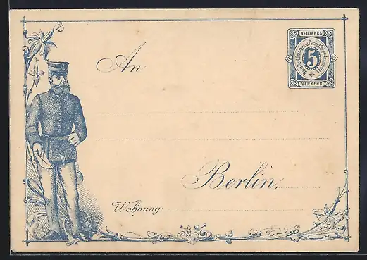 Dekorativer Brief Briefträger in Uniform, Private Stadtpost Neue Berl. Omnibus- u. Packetfahrt-Actien-Ges.