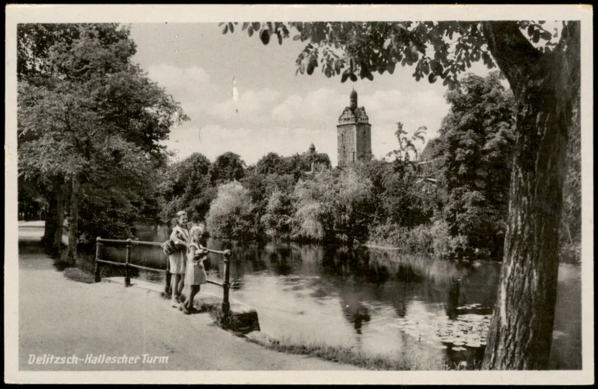 Delitzsch Kinder am Teich, Hallescher Turm zur DDR-Zeit 1954/1953