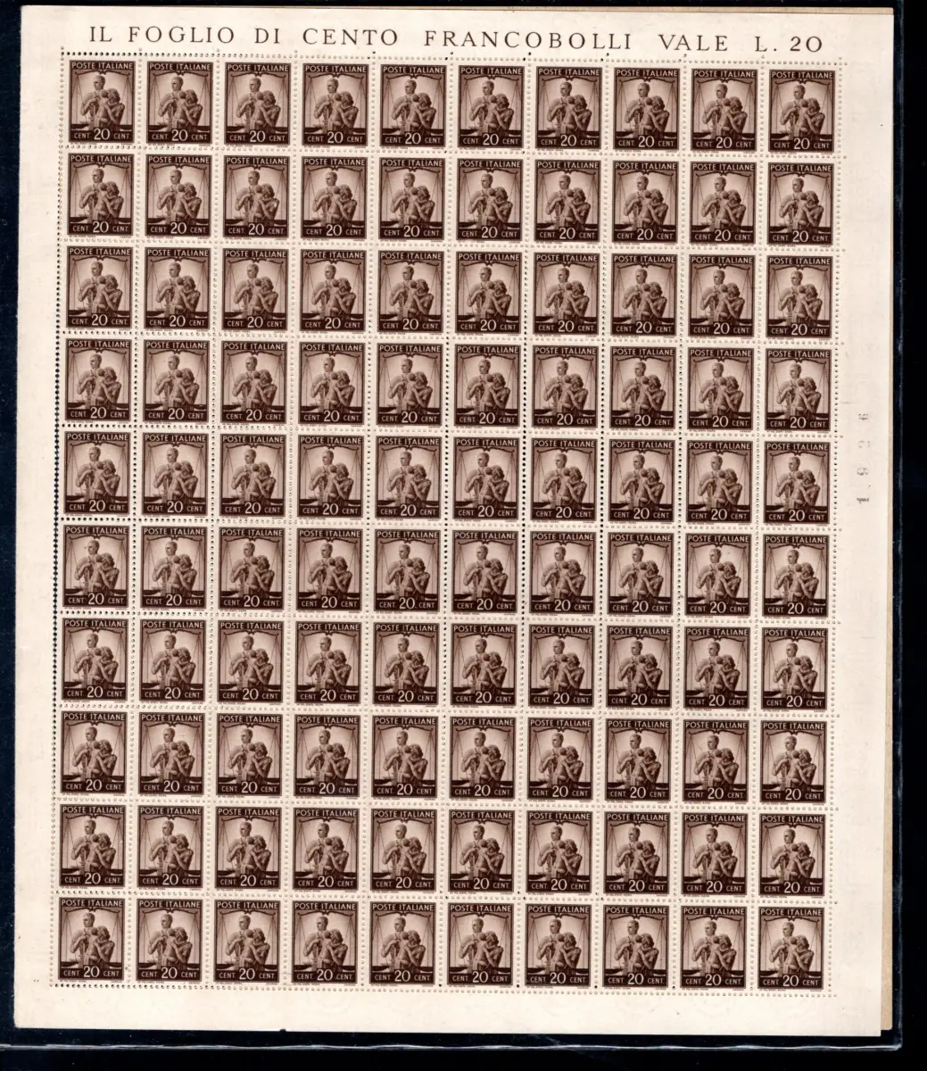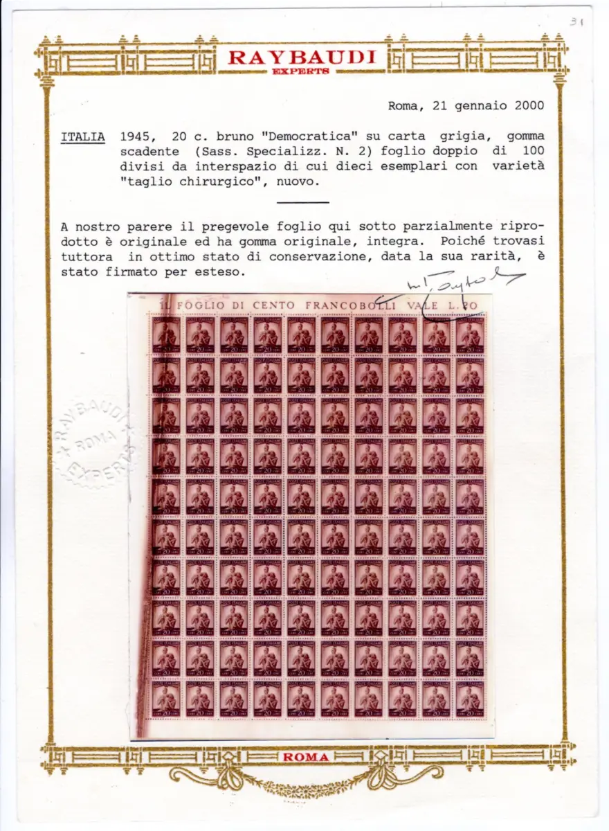 MNH - Vollgummi - Democratica Cent. 20 Nr. 544 Doppelblatt à 100 Exemplare geteilt durch Zwischenräume, davon 10 Exemplare mit stark eingefärbter chirurgischer Schnittvariante - Edles Set - Raybaudi Gold Zertifikat Cod. 3646/WEB