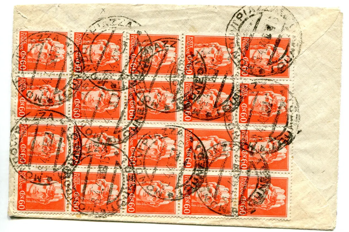 - Democratica Cent. 10 Nr. 543 sechs Exemplare + Ergänzungen Cent. 60 orange Nr. 539x24 (Windblock auf der Rückseite) auf Briefumschlag von Mondovi' nach Zürich am 5.4.46 - eine von vier Cent-Marken. 60 ist defekt - außergewöhnliche Mehrfachnutzung im Tarif Nr. 825/A